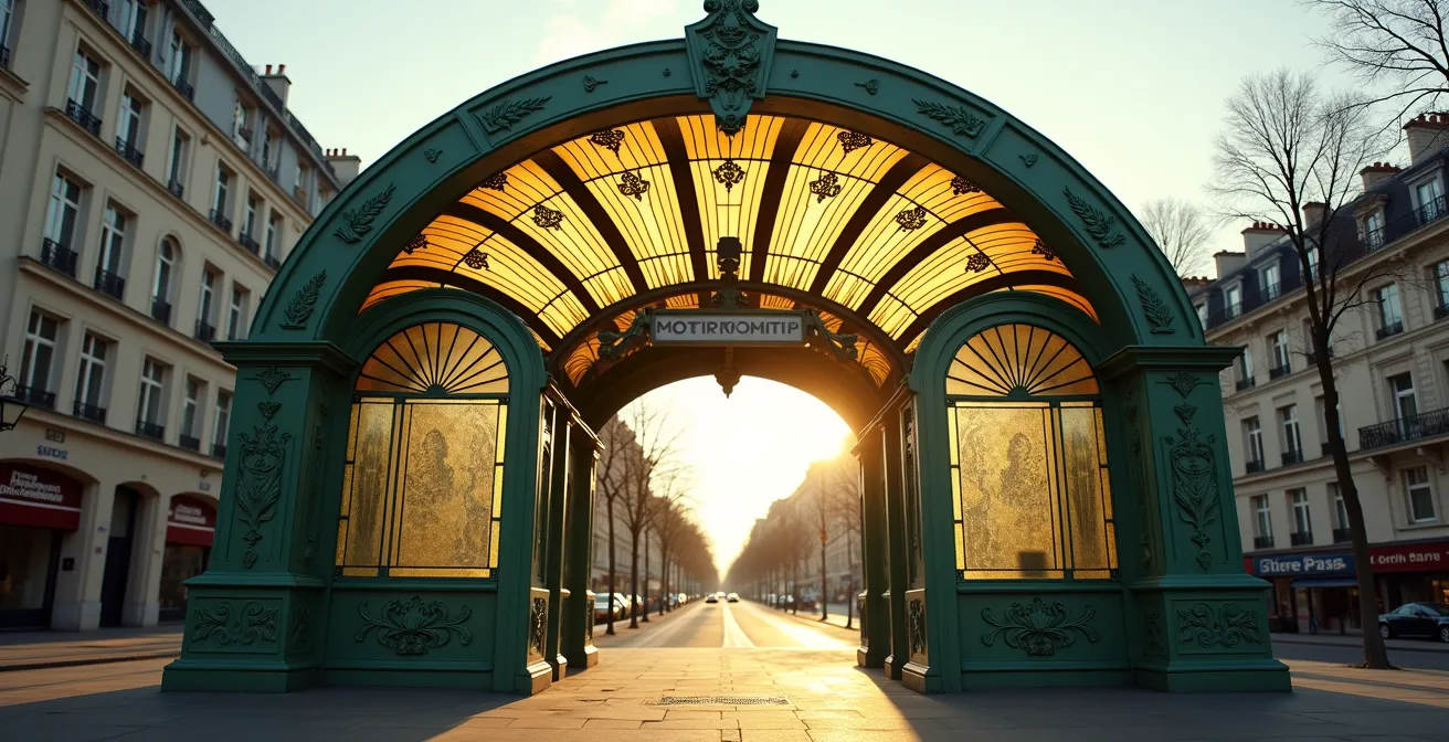 Unlike the more common open-air entrances with their “METROPOLITAIN” signs framed by two serpentine lampposts, Porte Dauphine’s structure is a complete architectural statement. It encapsulates the core of Art Nouveau: the rejection of industrial uniformity in favor of organic, nature-inspired forms. The cast iron structure is not merely functional; it twists and flows like plant stems, while the amber-colored glass panels cast a warm, dappled light. It’s a total work of art designed to transform the mundane act of entering the subway into a beautiful experience. But spotting a true Guimard requires a trained eye, as modern replicas can be convincing.